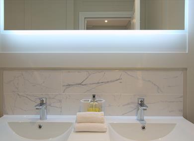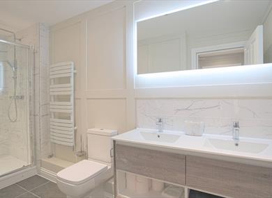 Walk in shower with soothing rain shower head, complimentary toiletries, luxury white marble tiling, his & hers vanity basins with storage, LED vanity mirror and heated towel rail.