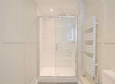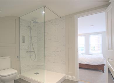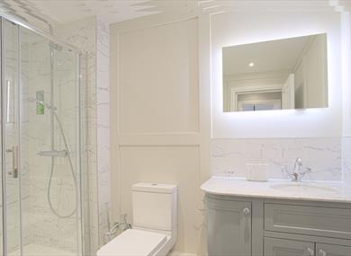 Walk in shower with soothing rain shower head, complimentary toiletries, luxury white marble sink, LED vanity mirrors and heated towel rail.