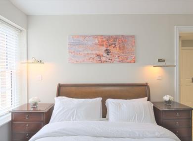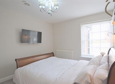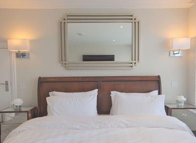 Super king size bed with hotel quality mattress and pillows, Egyptian linen, walk in wardrobe with plenty of storage space and 50” HD interactive flat screen tv.