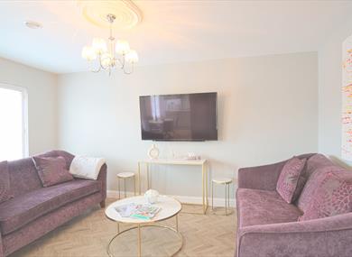 Comfortable and stylish 2 x three-seater sofa, Coffee and side tables, 50” HD interactive flat screen tv and mood lighting.