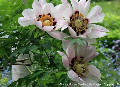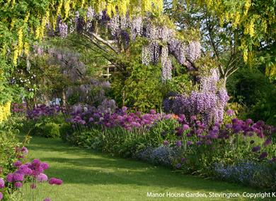 Mid to end May for arches of spring clematis, laburnum and wisteria heavily under planted with alliums, herbaceous borders, peony borders and cottage garden. The peonies are very special with numerous herbaceous peonies and new intersectional peonies....the king of plants. Early yellow and white Chinese roses adorn the house walls with white and blue wisterias.